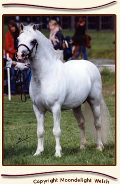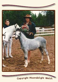 Moondelight Nereis s. -04 (e. W. Delight) 2004 Welsh Show. RP-Varsa, Poninäyttely: RP- ja Näyttelyn Paras Varsa 2006 Welsh Show: RP-Nuori, Res. Champion sec. A Poninäyttely: RP-Nuori, VV2, Svenska RIKS: Res. Youngstock Champion 2007 Welsh Show: I plk Poninäyttely: I plk, RP-Nuori, VV2 Suomen Hippos: 98889=42 p, I plk |