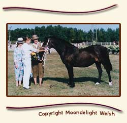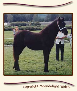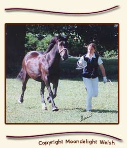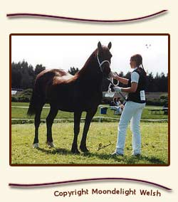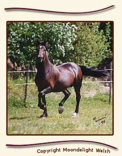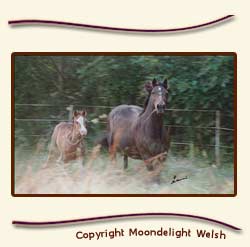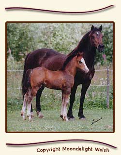 Meillä oloaikanaan Rosina on varsonut kahdesti; v.1999 tammavarsan, Moondelight Rosemary (i. Derwen Queens Counsel) ja v. 2001 orivarsan Moondelight Ran Tan Plan (kuva) (i. Misskärrs Lacrimosa).